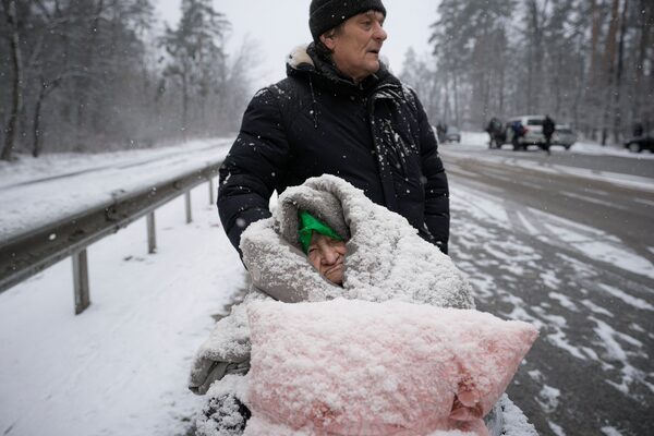 An elderly woman is evacuated from Irpin, on the outskirts of Kyiv, Ukraine, Tuesday, March 8, 2022 as demands for safe routes out of Ukraine grow.VADIM GHIRDA/The Associated Press