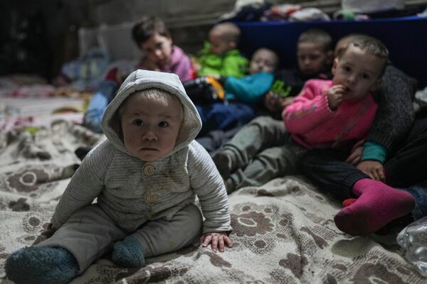 Children pose for a photographer in the bomb shelter in Mariupol, Ukraine, Sunday, March 6, 2022.Evgeniy Maloletka/The Associated Press
