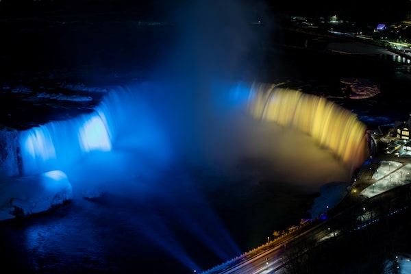 The iconic Horseshoe Falls are lit in the colours of the Ukrainian flag, following the Russian invasion in Ukraine, in Niagara Falls, Ontario, Canada February 27, 2022.NICK IWANYSHYN/Reuters