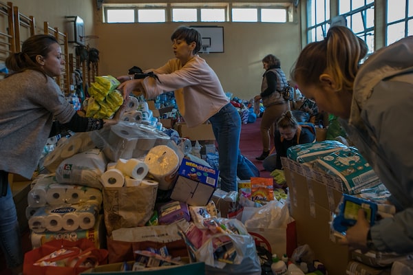 The gymnasium at School No. 11 in central Przemysl piled with bags of donated food and clothing for refugees from Ukraine.Anna Liminowicz/The Globe and Mail
