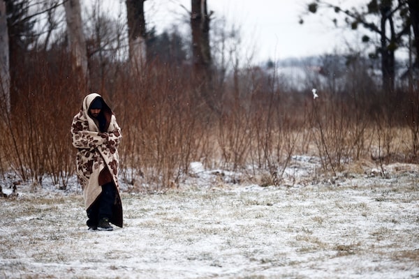 A person fleeing the Russian invasion of Ukraine walks wrapped in a blanket during a snowfall at a temporary camp in Przemysl, Poland, Feb. 28, 2022.YARA NARDI/Reuters