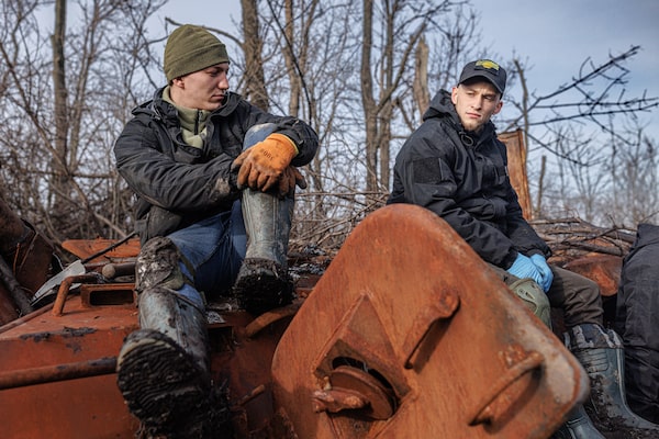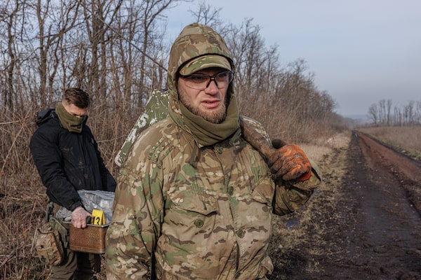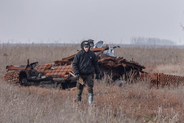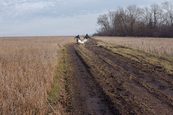 Reaching the dead, even farther from the front line, can be nearly as dangerous as getting to Bakhmut. The field outside Dovhenke – which had been the front line between Russian and Ukrainian positions for nearly six months between March and September – is littered with destroyed armoured vehicles, unexploded shells and anti-personnel mines. Twice, Mr. Yukov had to shout for his team to walk in single file between anti-tank mines planted on the right and left of the narrow footpath.
