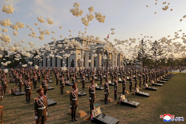 Balloons fly as soldiers stand in position next to memorial stones during the opening ceremony of the Memorial Museum of Combat Feats at the Overseas Military Operations honouring North Korean troops killed while fighting for Russia in the war against Ukraine, in Pyongyang, North Korea, on Sunday.Korean Central News Agency/via REUTERS
