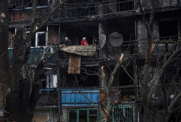Residents stand at the balcony of their flat in a building damaged by a Russian drone strike in the city of Kramatorsk, Donetsk region in Ukraine.Anatolii Stepanov/Reuters