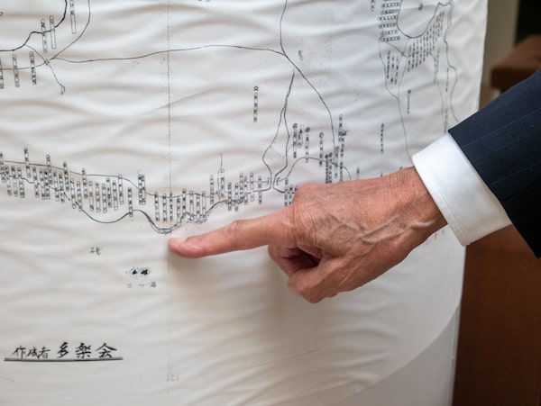 In Nemuro, Mr. Kawada points on a map to the island where he grew up.