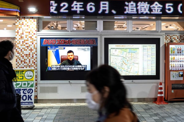 Pedestrians in Tokyo pass a screen showing live footage of Ukraine's President addressing the Japanese parliament this past March.CHARLY TRIBALLEAU/AFP via Getty Images