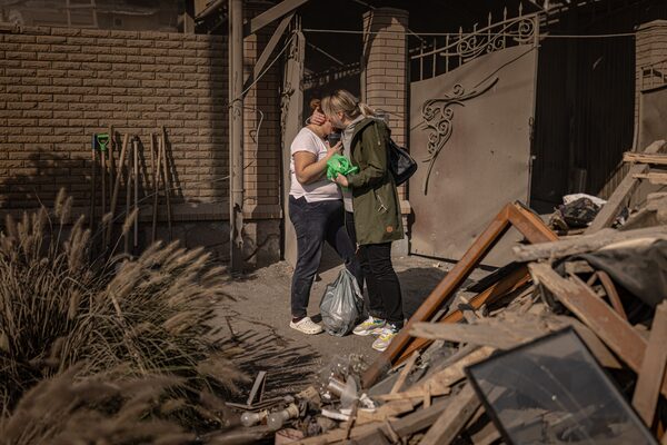 A friend hugs Anna Novostroynaya, whose house was damaged in a rocket attack in Dnipro, Ukraine, Sept. 29 2022.Anton Skyba/The Globe and Mail