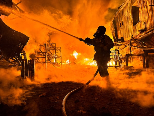 A firefighter works at a site of a Russian drone strike, amid Russia's attack on Ukraine, in Kharkiv, Ukraine May 4, 2024.Vitalii Hnidyi/Reuters