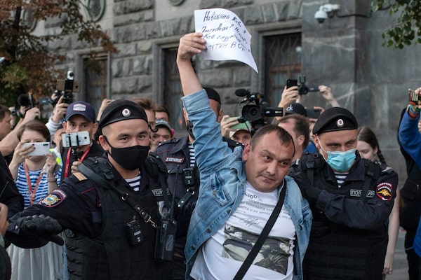 Police officers detain a protester as he comes to support Russian opposition leader Alexey Navalny in front of the building of the Federal Security Service, in Moscow, on Aug. 20, 2020.Pavel Golovkin/The Associated Press