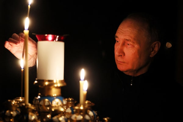 In this pool photograph distributed by the Russian state agency Sputnik, Russia's President Vladimir Putin lights a candle during his visit to a church of the Novo-Ogaryovo state residence outside Moscow on March 24, during a national day of mourning.MIKHAIL METZEL/Getty Images