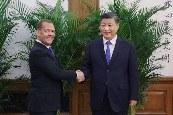 Deputy head of Russia's Security Council and chairman of the United Russia party, Dmitry Medvedev, left, shakes hands with Chinese President Xi Jinping before their meeting in Beijing, on Dec. 21.Liu Weibing/The Associated Press