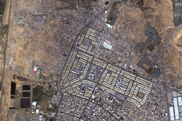 This satellite image provided by Maxar Technologies shows an overview of tents, shelters and people in Rafah, Gaza, on Feb. 7.The Associated Press