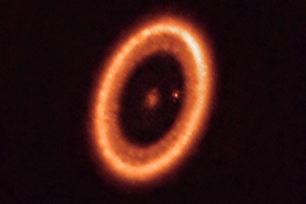 The orange-colored star PDS 70, roughly the same mass as our sun, is about 5 million years old – a blink of the eye in cosmic time. The two planets are even younger.