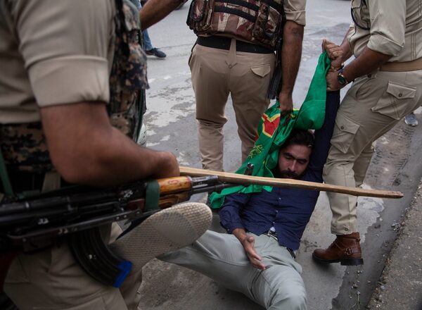 Indian policemen detain a Kashmiri Shiite Muslim who attempted with others to take out a religious procession in Srinagar, Indian controlled Kashmir, Friday, Aug. 28, 2020.Mukhtar Khan/The Associated Press