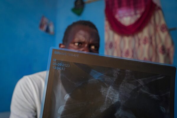 Mr. Mbaye reviews the X-rays from his time in hospital after being rescued at sea.