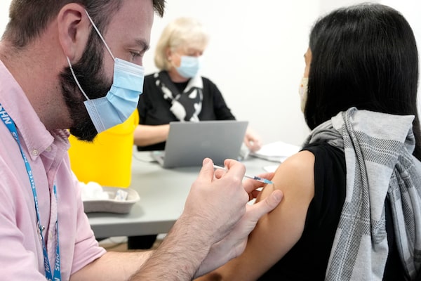 Vaccinator Daniel Zadorozni gives a Pfizer COVID-19 vaccine in London, England, Dec. 1, 2021.Kirsty Wigglesworth/The Associated Press