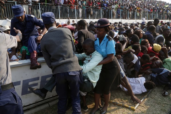 Injured mourners are helped after a crowd pushed their way past police to try to get closer to the coffin of former Zimbabwe president Robert Mugabe.Themba Hadebe/The Associated Press