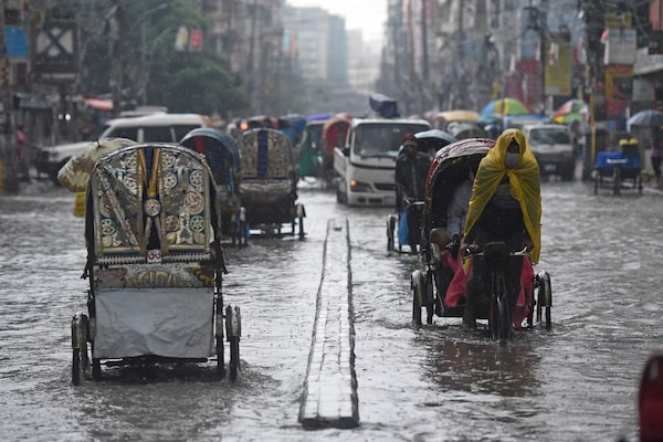 Rickshaw pullers make their way through a water-logged street after a heavy downpour in Dhaka, Bangladesh, on July 21, 2020.MUNIR UZ ZAMAN/AFP/Getty Images