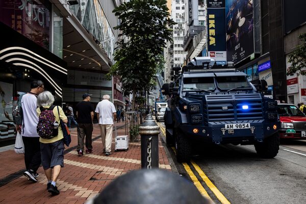 Pedestrians walk past an armoured police vehicle on a street in the Causeway Bay district.ISAAC LAWRENCE/Getty Images