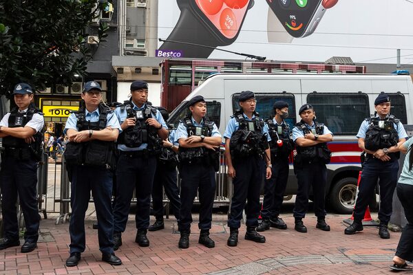 Police officers stand guard in the Causeway Bay area on the 35th anniversary of China's Tiananmen Square crackdown in Hong Kong, on June 4.Chan Long Hei/The Associated Press