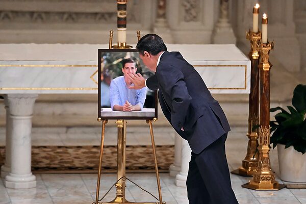 Alex Lucido, a close family friend, touches a portrait of Michigan State University student Brian Fraser, who was killed by a gunman the night before on campus in East Lansing, during a vigil at St. Paul on the Lake Catholic Church in Grosse Pointe, Mich., on Feb. 14.David Guralnick/The Associated Press