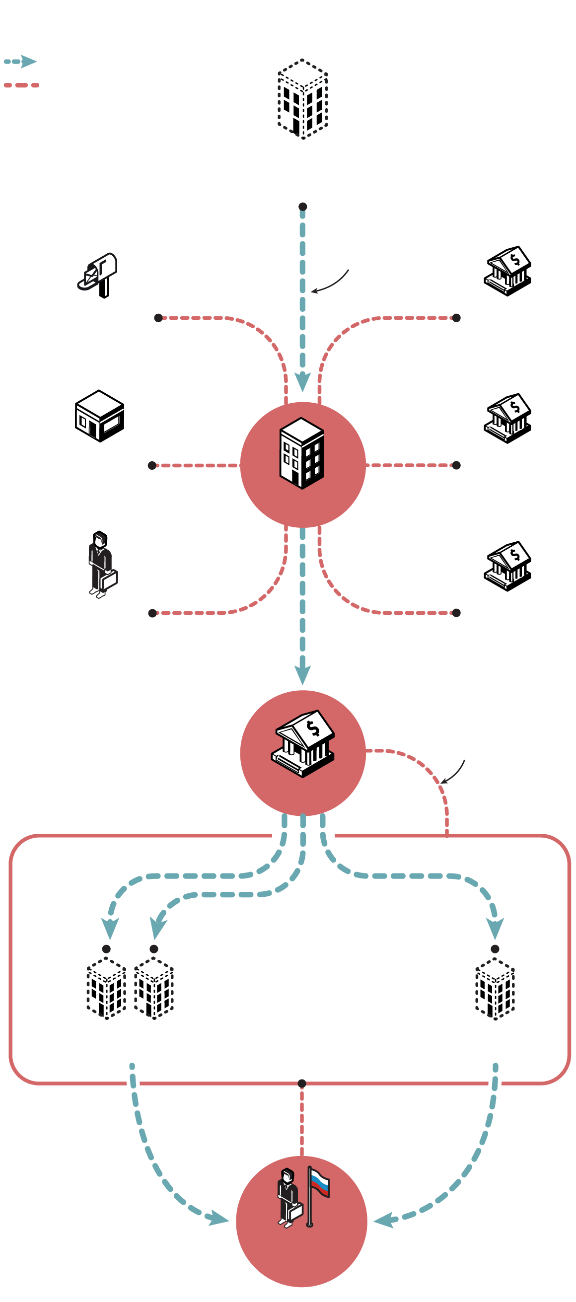 Those intermediary companies sent the money west, often via Austria’s Raiffeisen Bank or Germany’s Deutsche Bank − institutions that are themselves involved in multiple controversies − before the money was cycled back “clean” to other companies with accounts at Ukio.