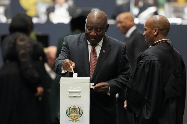 South African President Cyril Ramaphosa casts his ballot in a vote for the speaker of parliament during the first sitting of the National Assembly following elections at the Cape Town International Convention Center in Cape Town, South Africa, on June 14.Nic Bothma/Reuters