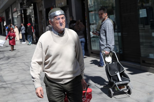 A man wearing a protective face shield heads to a queue outside a supermarket during the coronavirus disease outbreak in Madrid, Spain, March 29, 2020.SUSANA VERA/Reuters