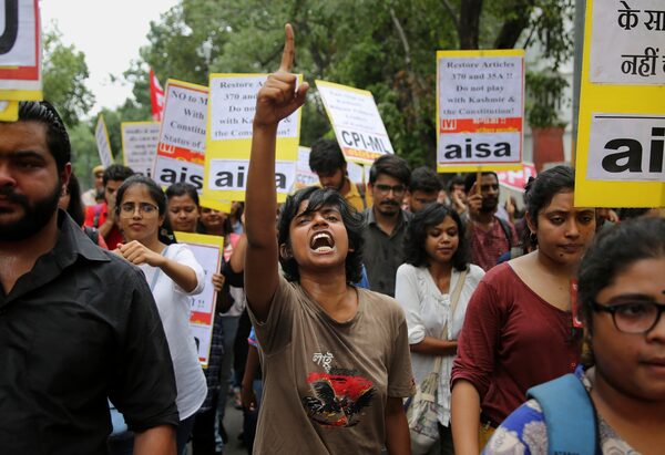 Indian activists and others shout slogans during a protest against Indian government revoking Kashmir's special constitutional status in New Delhi, India.Altaf Qadri/The Associated Press