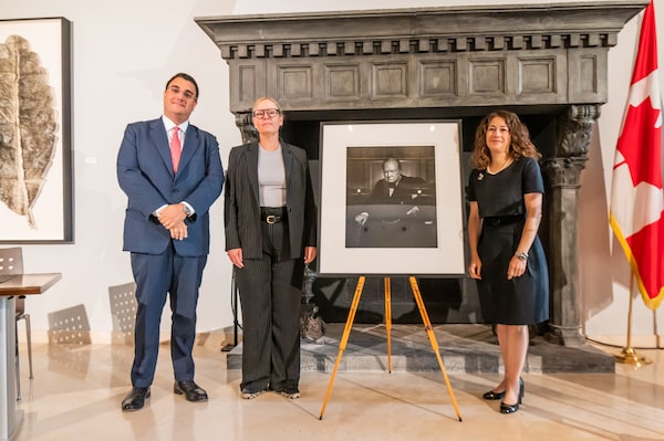 From left, Nicola Cassinelli, an Italian lawyer and occasional art collector, Canadian Cultural Heritage Deputy Minister, Isabelle Mondou and Ambassador of Canada to Italy, Elissa Golberg, pose next to of a photographic portrait known as 'The Roaring Lion', taken by photographer Yousuf Karsh in 1941 of Britain's Prime Minister Winston Churchill, stolen in Canada in 2022 and returned during a ceremony at the Canada's embassy in Rome, Thursday, Sept. 19, 2024.Fabrizio Troccoli/The Globe and Mail
