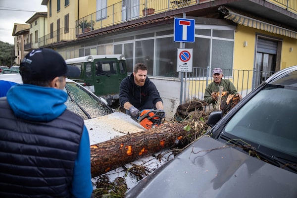 Men cut down a tree that has fallen on cars in Montemurlo, in the province of Prato, in the Italian region of Tuscany.FEDERICO SCOPPA/AFP/Getty Images