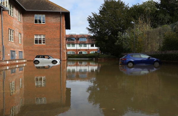 Partially submerged cars in an office car park, in Leatherhead, southern Britain, on Nov. 3.TOBY MELVILLE/Reuters