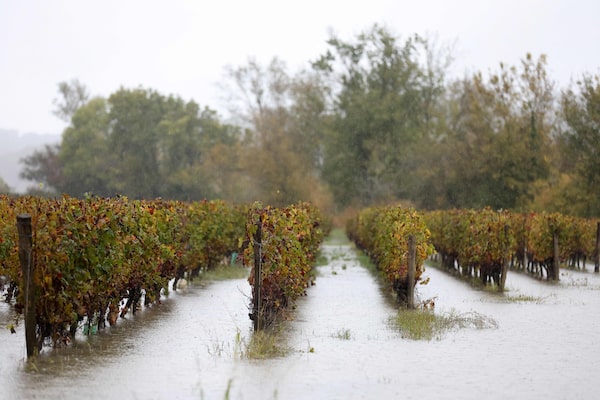 Water floods a Bordeaux vineyard in Portets, southwestern France, on Nov. 3.ROMAIN PERROCHEAU/AFP/Getty Images