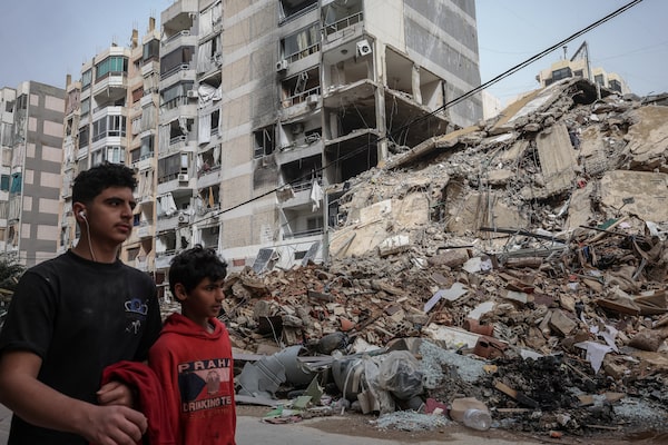 People walk past a destroyed buildings in Beirut's southern suburbs on April 18. Since the war began more than 2,290 have been killed in Lebanon.Marko Djurica/Reuters