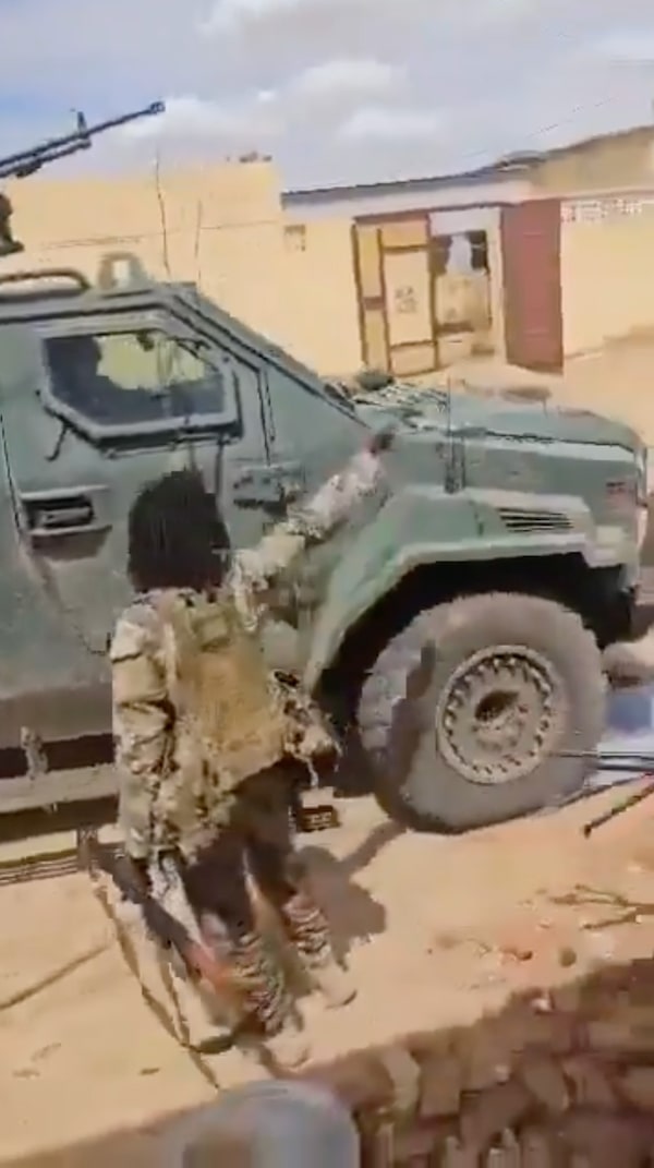Screenshot of a video showing Rapid Support Forces fighters using a Streit Spartan armoured vehicle during their assault on El Fasher, the capital of North Darfur, which has been under an RSF siege for more than a year. The video was posted to X by Africa analyst Umut Çağrı Sarı in August 2025.X