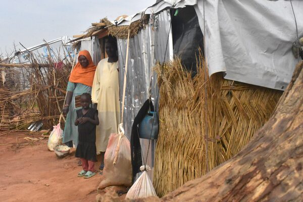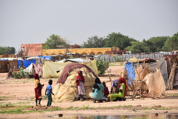 A family gathers in front of their makeshift shelter in Adre, Chad, on July 18. The lack of basic amenities, such as clean water and proper sanitation, highlights the harsh conditions they endure daily.