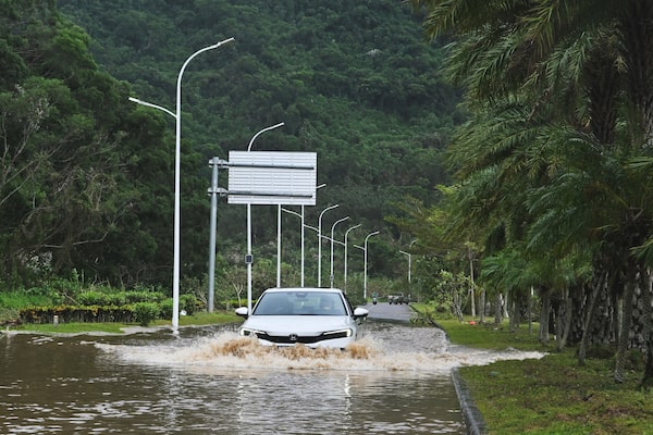 A car drives through a flooded street following the passage of Super Typhoon Ragasa in Yangjiang, southern China's Guangdong province on Thursday.ADEK BERRY/AFP/Getty Images