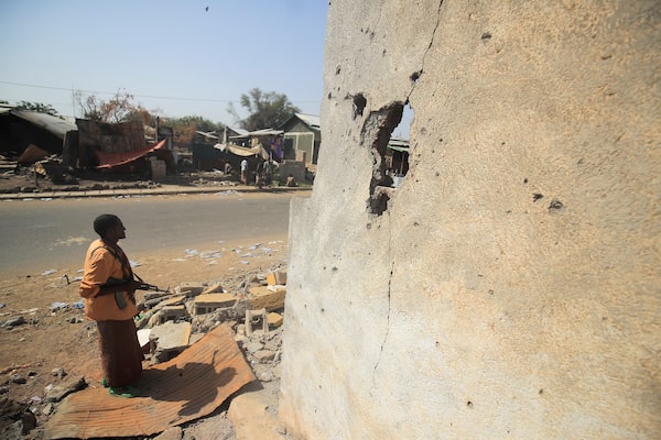 Armed militia stands next to a house damaged during the fight between the Ethiopian National Defence Forces and the Tigray People's Liberation Front, in Kasagita town, Ethiopia, on Feb. 25.TIKSA NEGERI/Reuters