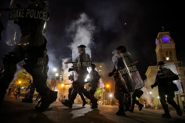 Police officers move past Louisville City Hall to clear protesters from a plaza, on Sept. 23, 2020.CARLOS BARRIA/Reuters