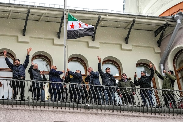 Members of the Syrian diaspora wave while flying the Syrian opposition flag at the Syrian Embassy, in Moscow, Russia, on Dec. 9.Alexander Zemlianichenko/The Associated Press