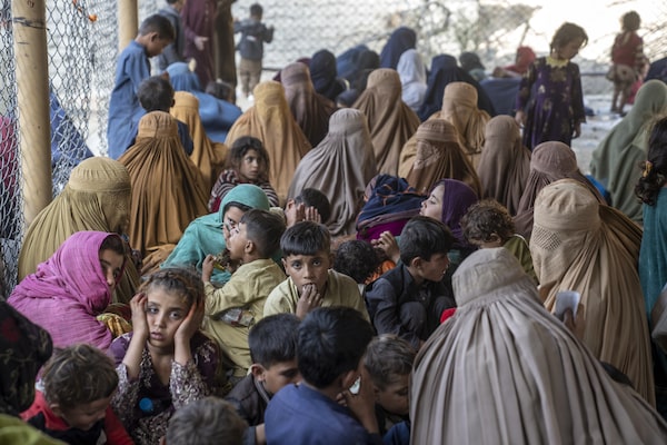 Afghan refugees wait at the Torkham Pakistan-Afghanistan border to be transferred to a camp near the border, in Torkham, Afghanistan, Nov. 3, 2023.Ebrahim Noroozi/The Associated Press