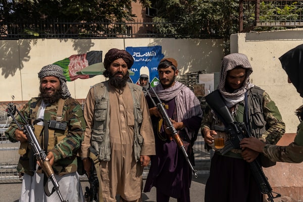 Taliban fighters guard the Afghanistan central bank in Kabul, Afghanistan on Aug. 19.Victor J. Blue/The New York Times News Service
