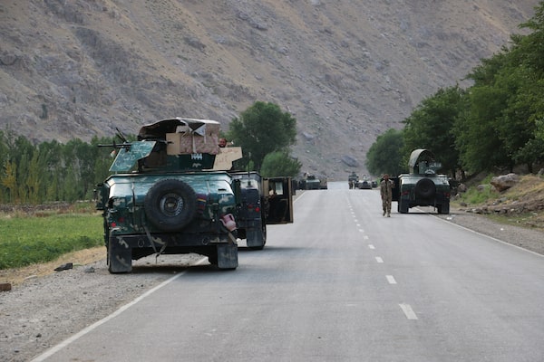 Afghan soldiers pause on a road at the front line of fighting between Taliban and Security forces, near the city of Badakhshan, northern Afghanistan, on July. 4, 2021.Nazim Qasmy/The Associated Press