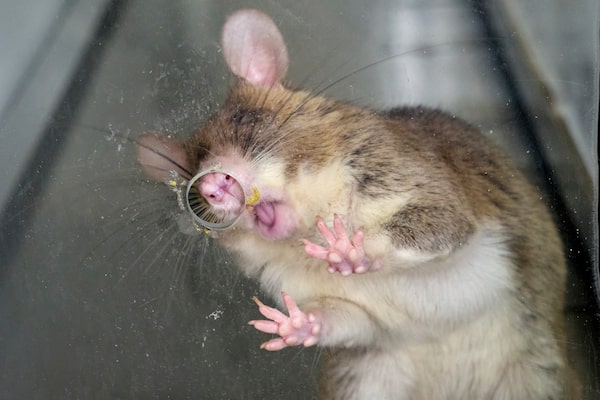 An African giant pouched rat being trained to detect tuberculosis licks a treat off glass in APOPO's laboratory.Jack Denton/The Associated Press