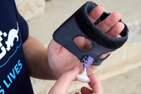 Dr. Fabrizio Dell'Anna, an animal behaviourist at APOPO, demonstrates a specialized backpack for search and rescue rats.Jack Denton/The Associated Press