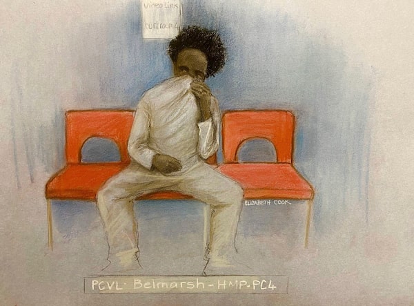 A court artist drawing by Elizabeth Cook of Axel Rudakubana, 18, appearing by video-link from Belmarsh prison at London's Westminster Magistrates' Court on Oct. 30.Elizabeth Cook/The Associated Press