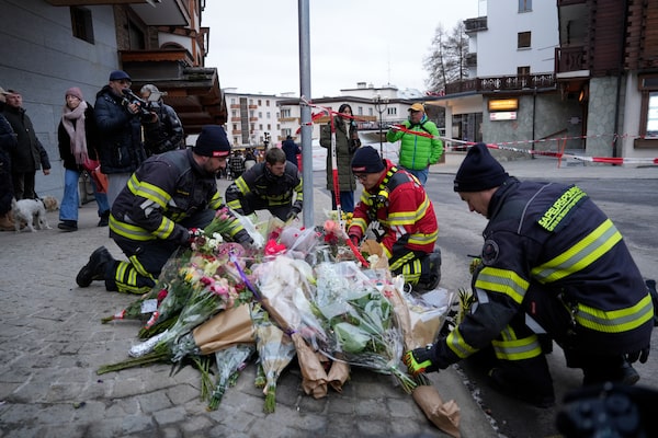 Firefighters lay flowers on Friday near the sealed-off Le Constellation bar in Crans-Montana, Switzerland, where a devastating fire ripped through a ski resort bar during New Year's celebrations.Baz Ratner/The Associated Press