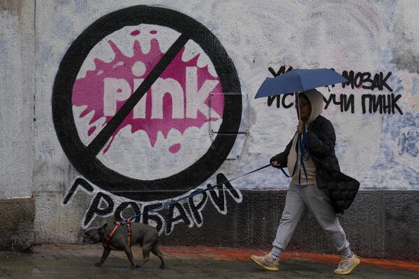 A woman with a dog walks by a mural signed by Partizan club fans, reads: "Turn on your brain, switch off Pink," referring to Pink TV's overwhelming pro-government propaganda and violent content on reality shows, in Belgrade, Serbia, on May 12.Darko Vojinovic/The Associated Press