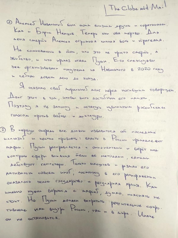 Mr. Yashin has argued – in a pair of handwritten letters sent from jail to The Globe and Mail – that Russia’s opposition can be relevant only if it is based inside Russia, living among those it hopes to inspire and lead. (Letters from The Globe, and Mr. Yashin’s responses from behind bars, were exchanged via his lawyer.)