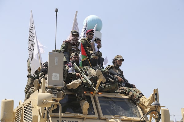 Taliban fighters celebrate the third anniversary of the withdrawal of U.S.-led troops from Afghanistan, in Kabul, on Aug. 14.Siddiqullah Alizai/The Associated Press